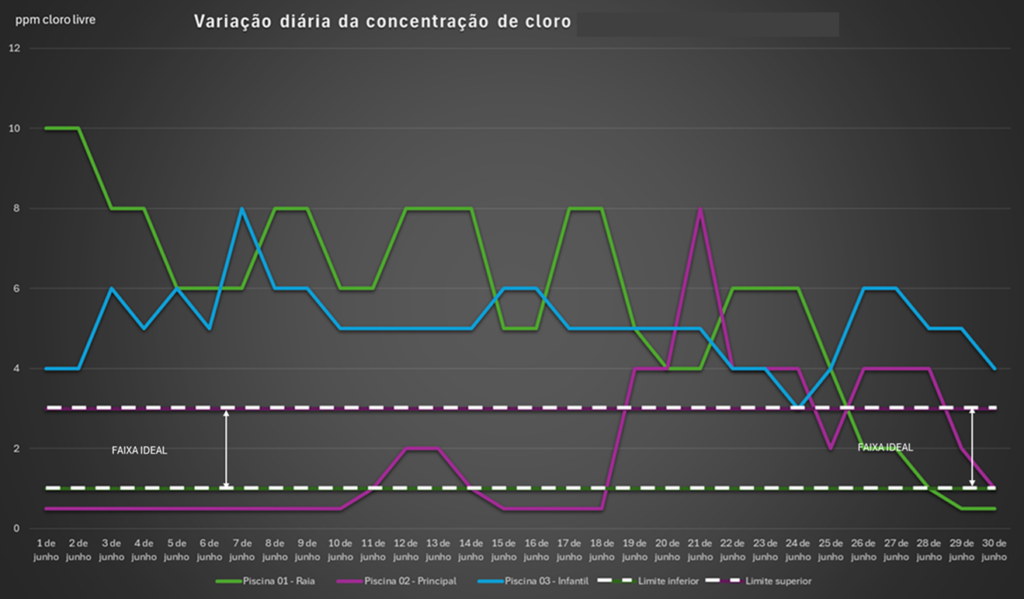 da piscina deve ser mantida entre 0,8 mg/L a 3,0 mg/L de cloro livre. A concentração de cloro na água