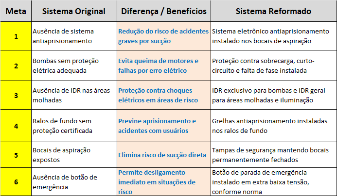 Essas adequações reduzem riscos elétricos, hidráulicos e operacionais, aumentando a segurança dos usuários e a confiabilidade do sistema.